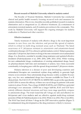 artemisinin-resistant malaria, and (3) malaria prevention in the community. This